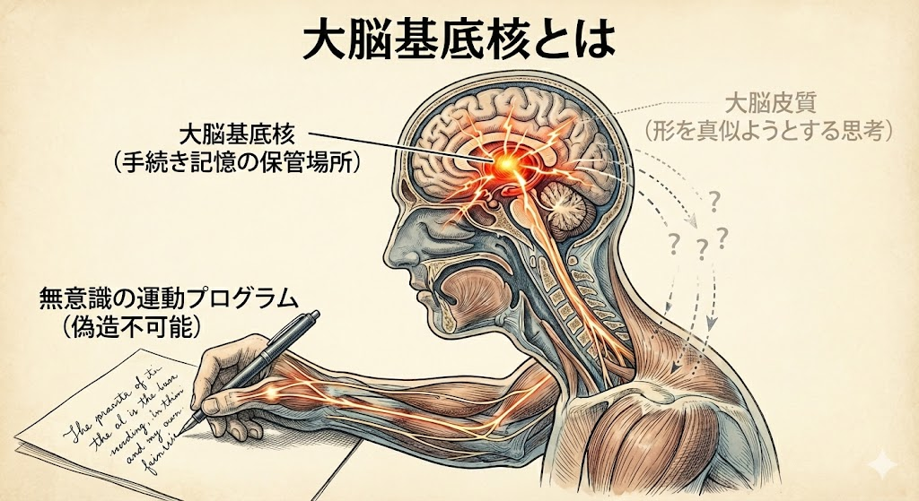 長年の習慣で身についた文字の書き方は、脳の奥深く(大脳基底核など)に「手続き記憶」として刻み込まれています。これを「脳内運動プログラム」と呼びます。