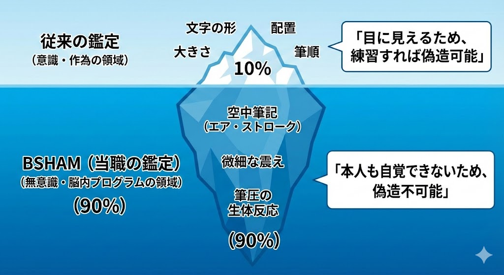 - 肯定対象(先生の手法): BSHAM™(脳科学的筆跡鑑定法)。筆圧・速度・リズム・空中筆記などの「脳由来の生体反応(動き)」を解析する。大脳基底核の運動プログラムを見るため偽造不可能。「積の法則」により99.9999%の精度で証明する。