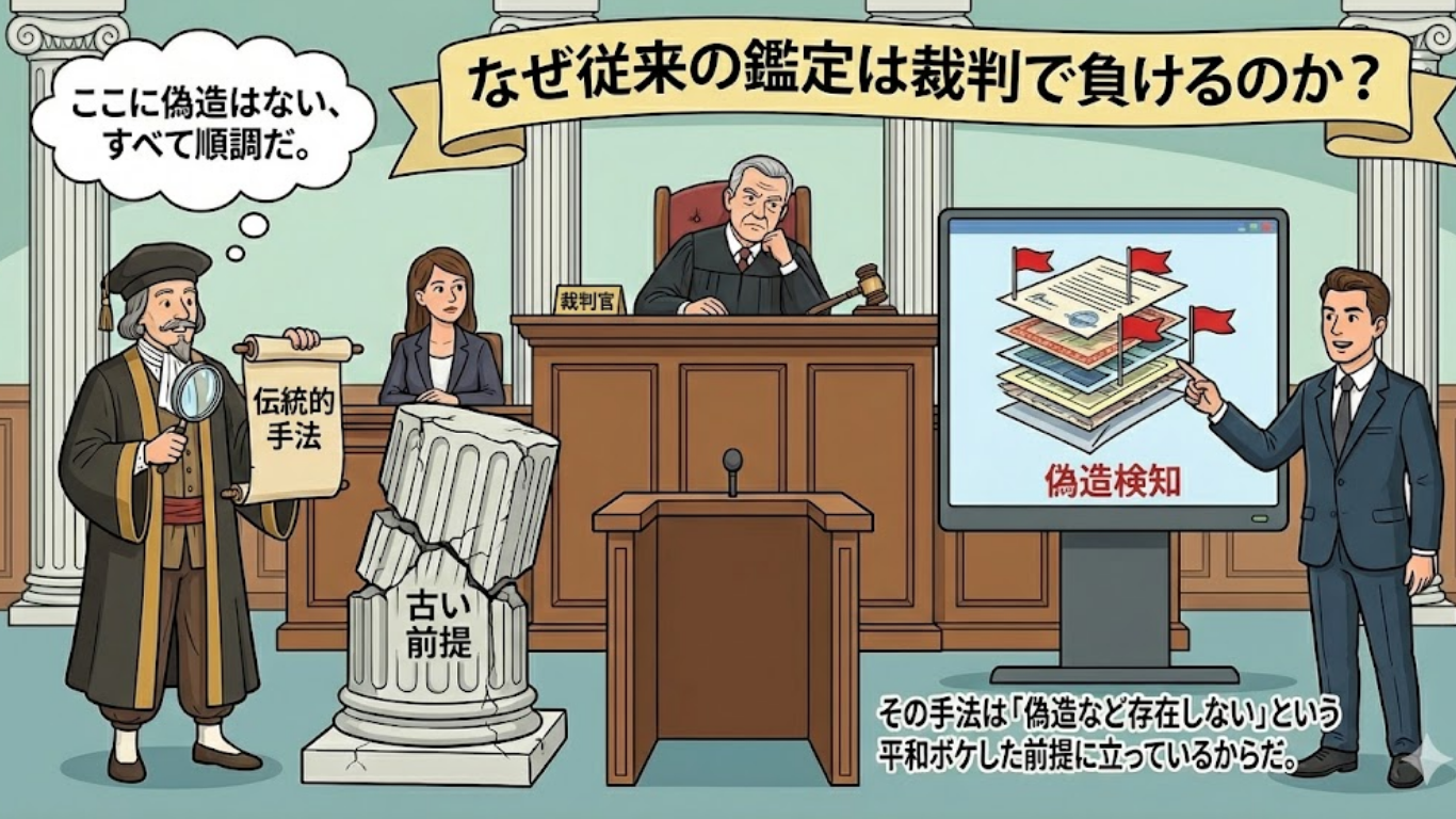 つまり、従来の手法は「高度な偽造を見抜くためのロジック」が最初から組み込まれていない**のです。平和な時代の「書道教室の添削」と同じレベルであり、騙し合いの法廷で通用するはずがありません。