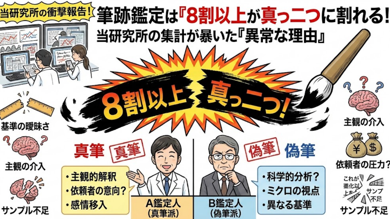 今回は、なぜ筆跡鑑定はいつも「水掛け論」に終わるのか、当研究所のデータが裏付けるその異常な理由を暴露します。