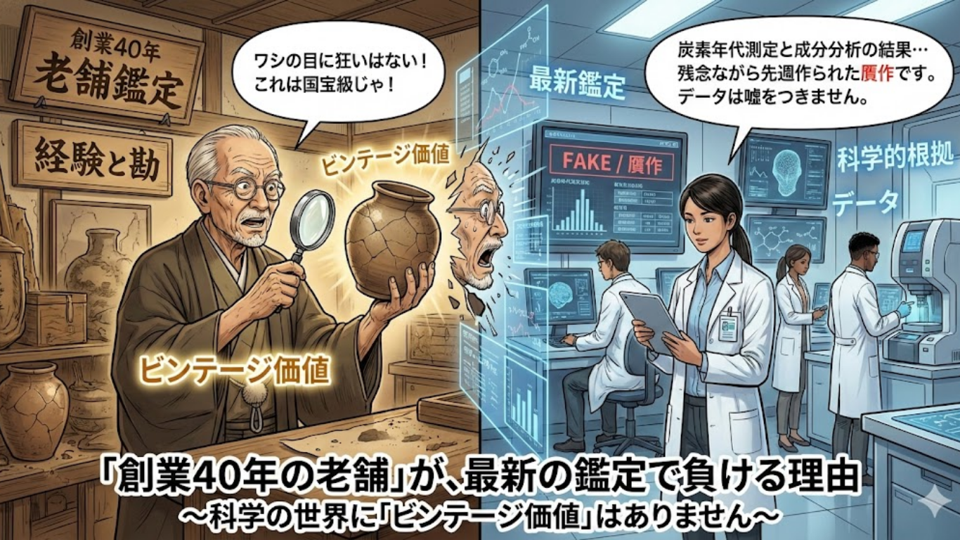 ある大手鑑定機関の業績リストを見ると、彼らの主力技術である「数値解析(多変量解析)」の論文が最初に発表されたのは、1984年(昭和59年)です 。 パソコンが一般家庭になく、インターネットも普及していない時代に作られた「定規で測って計算する技術」。 彼らはそれを、令和の今もなお「最新」として使い続けています。