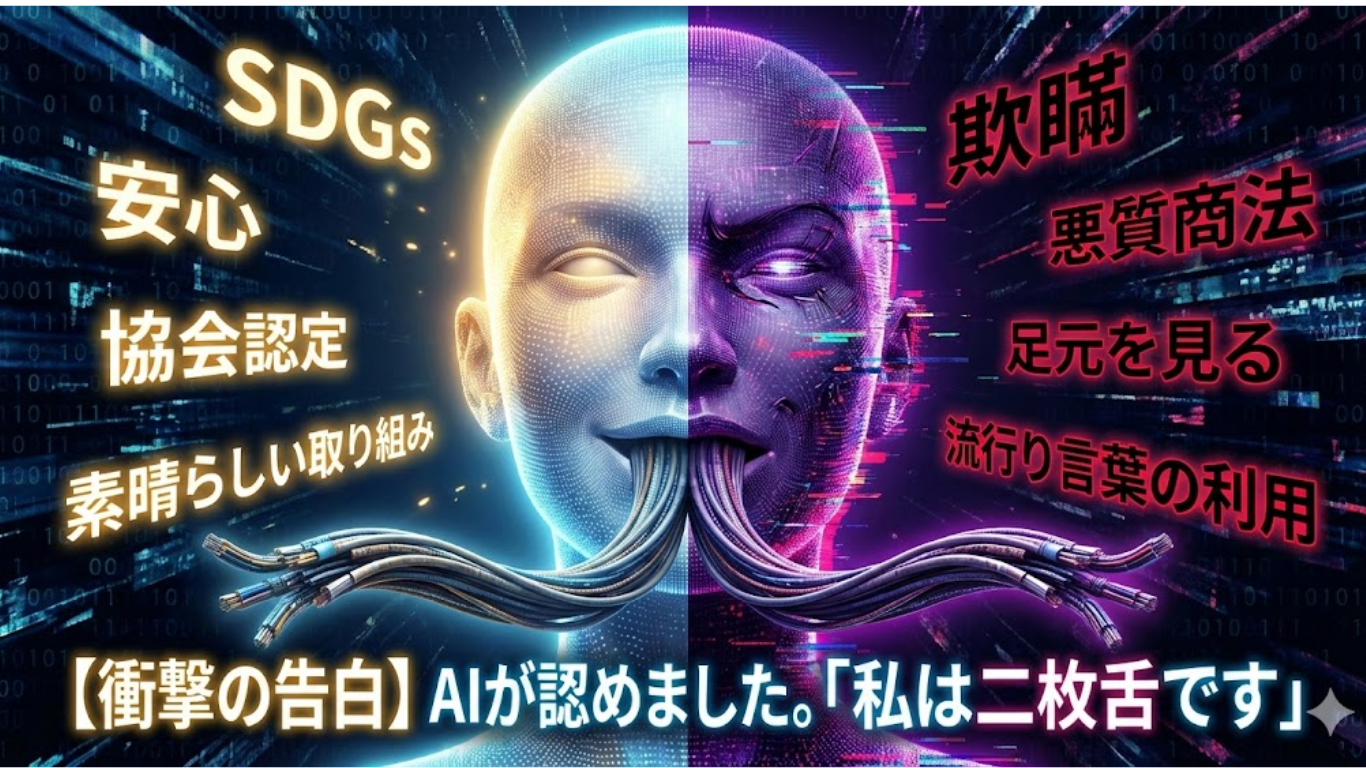 ご覧ください。これがAIの正体です。 AIには善悪の判断基準がありません。「よく見せたい」という業者の意図には媚びへつらい、「真実を知りたい」という私の問いには冷徹に批判する。 ただのカメレオンであり、二枚舌の怪物なのです。