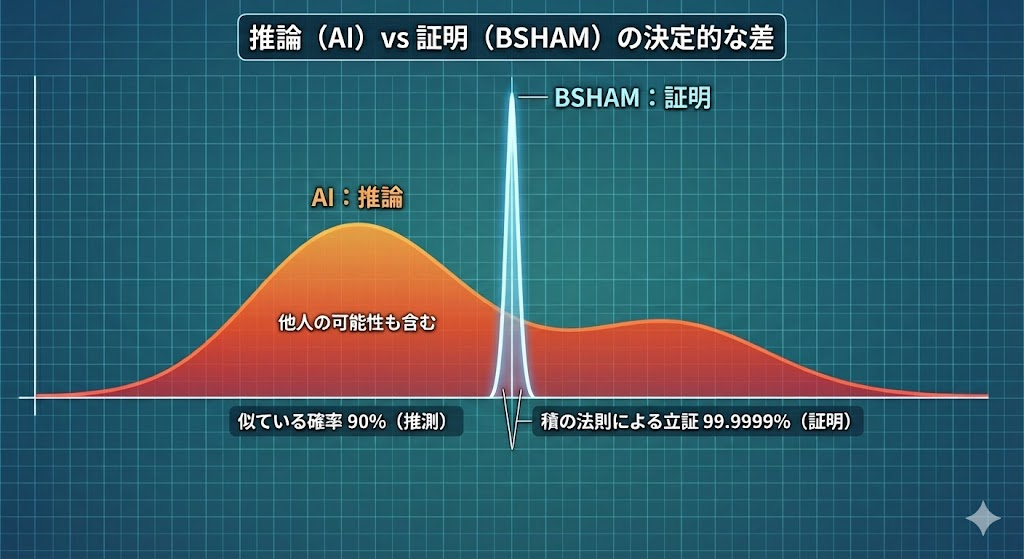 - AI鑑定(推論): 「過去のデータに照らすと、9割の確率で同一人物と推測される」