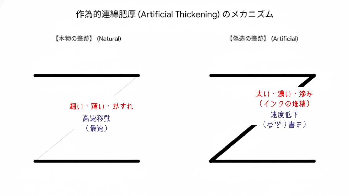 私は、この物理現象を「作為的連綿肥厚(Artificial Thickening)」と名付けました。 「抑揚がない」という主観的な感想ではなく、「速度低下によってインクが物理的に堆積した状態」と定義したのです。