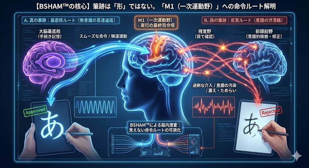 【BSHAM™の核心】筆跡は「形」ではない。「M1(一次運動野)」への命令ルートを解明せよ