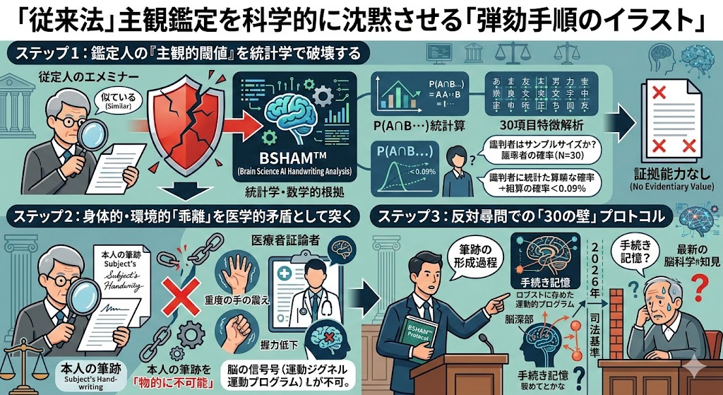 「裁判所が選んだのだから正しいはずだ」という思考停止は、敗訴への直行便です。脳科学AI筆跡鑑定®(BSHAM™)の視点から、相手方の鑑定書を法的に「弾劾」するための具体的な実務プロトコルを公開します。